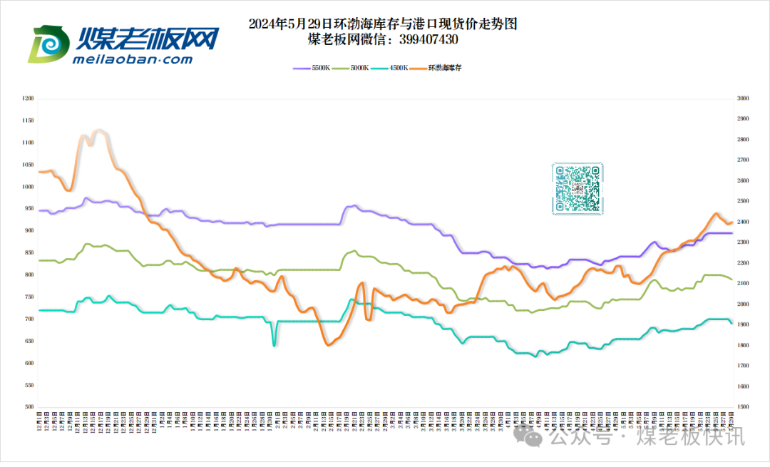 从环渤海六个港口交易价格的采集情况看,本期共采集样本单位79家,样本数量为306条。5500K热值(硫分:0.6%-1%)的现货综合价格为885元/吨,长协综合价格为697元/吨,现货与长协的计算比例为1:9。从计算结果看,本报告期24个规格品中,价格上行的有6个,涨幅均为5元/吨,其余规格品价格持平(2024年5月22日至2024年5月28日)。