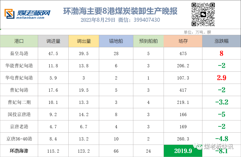 HW三号井煤矿:2023年8月30日7时起:籽面↑20 籽煤↑20 块煤↑20