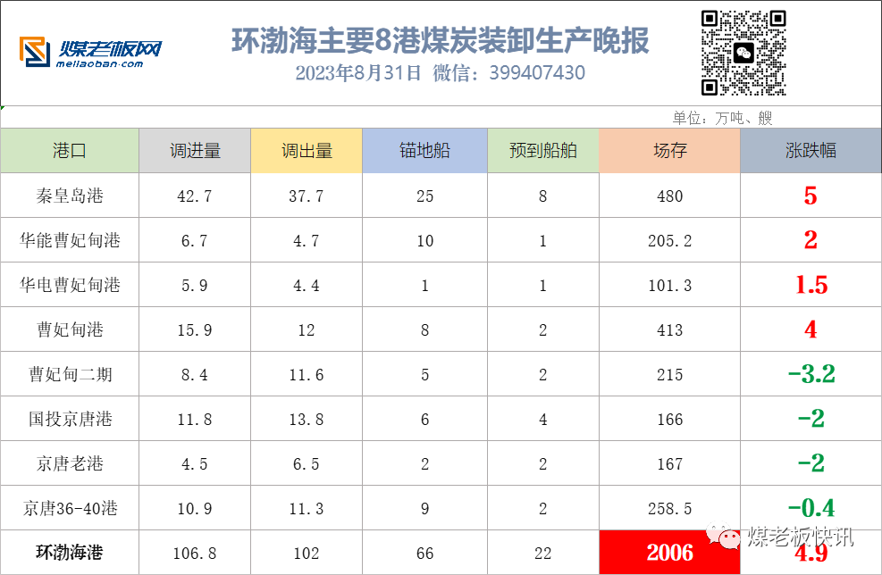 HW三号井煤矿:2023年8月31日18时起:籽面↑10 籽煤↑20 块煤↑10