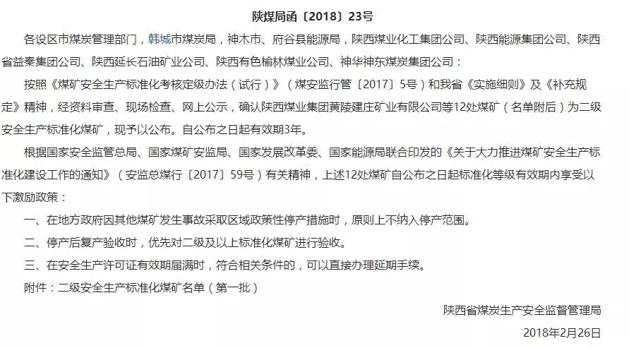 陕西第一批二级安全生产标准化煤矿名单的公示