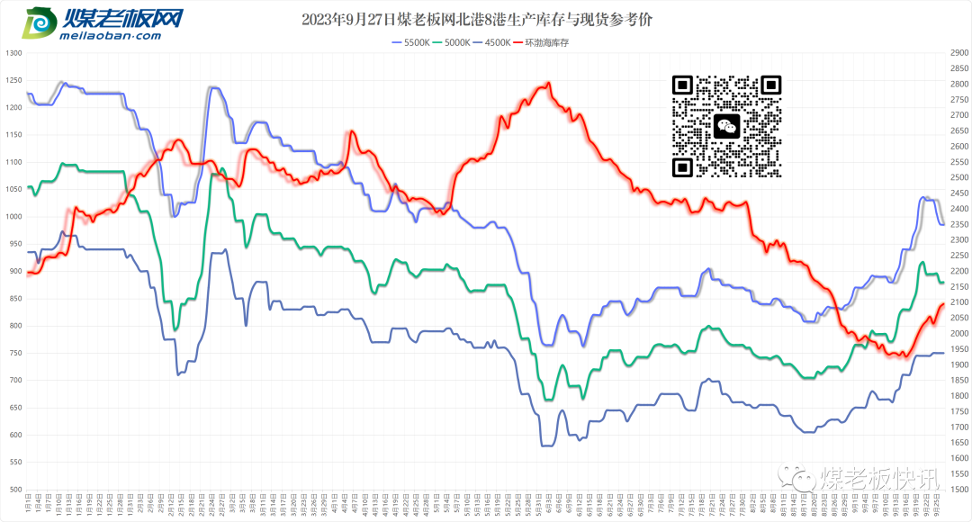 港口:最新北港实际货源报价经连续几天的下跌后开始持平,港口库存续增,市场观望情绪依然浓厚,终端询货及拉运积极性低。最新北港库存合计:2102.2万吨,库存上涨9.6万吨。最新沿海八大电厂调入量136.3万吨,调出量127.1万吨。最新实际货源报价:5500卡970~1000;5000卡870~900;4500卡750;实际成交价:5500卡985~995;5000卡872~878;4500卡751。