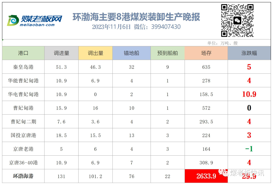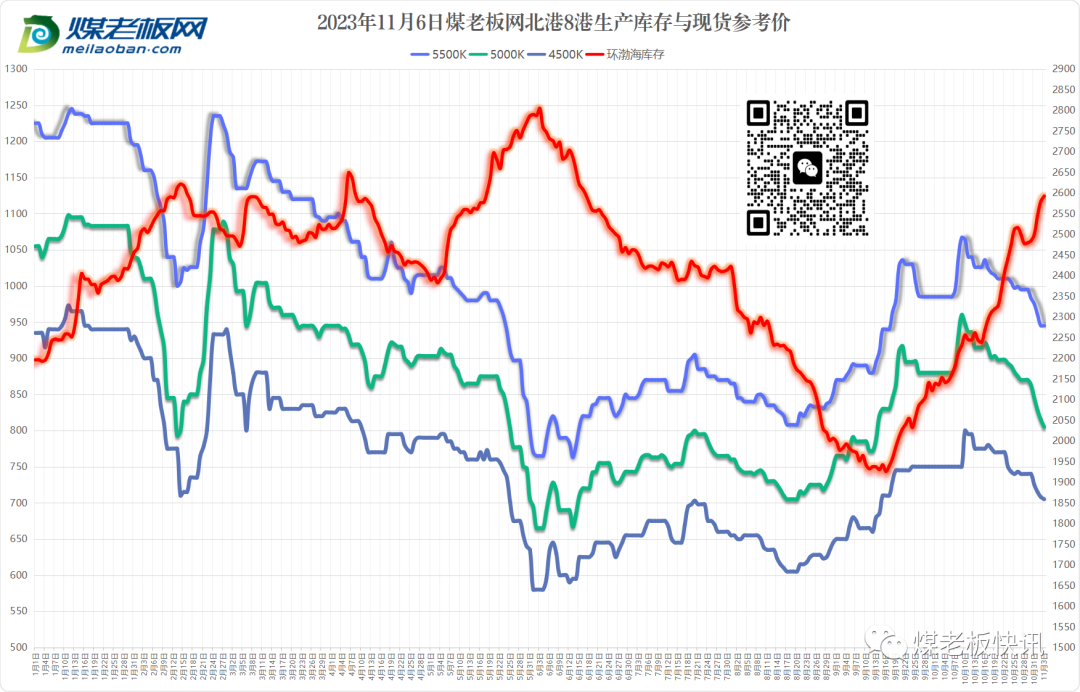 大规模的采储并未开启,电厂、港口库存维持中高位,日耗提增较缓,叠加大企外购降价冲击,暂时价格弹涨空间或有限。随着全国大面积的骤然降温,东北、内蒙等强雨雪极端天气,因担忧冬储采购价格会集中上涨,抄底心态强烈,部分煤贸商提前加快采购节奏;同时年末岁尾,煤矿安全形势严峻,煤矿设备检修或搬家倒面数量有预期增加,叠加冬储支撑,部分市场需求释放,目前港口、电厂库存整体偏中高位,据最新数据了解,11月6日,沿海六大电合计库存1433.6万吨,日耗78.23万吨,可用天数保持18.3天。