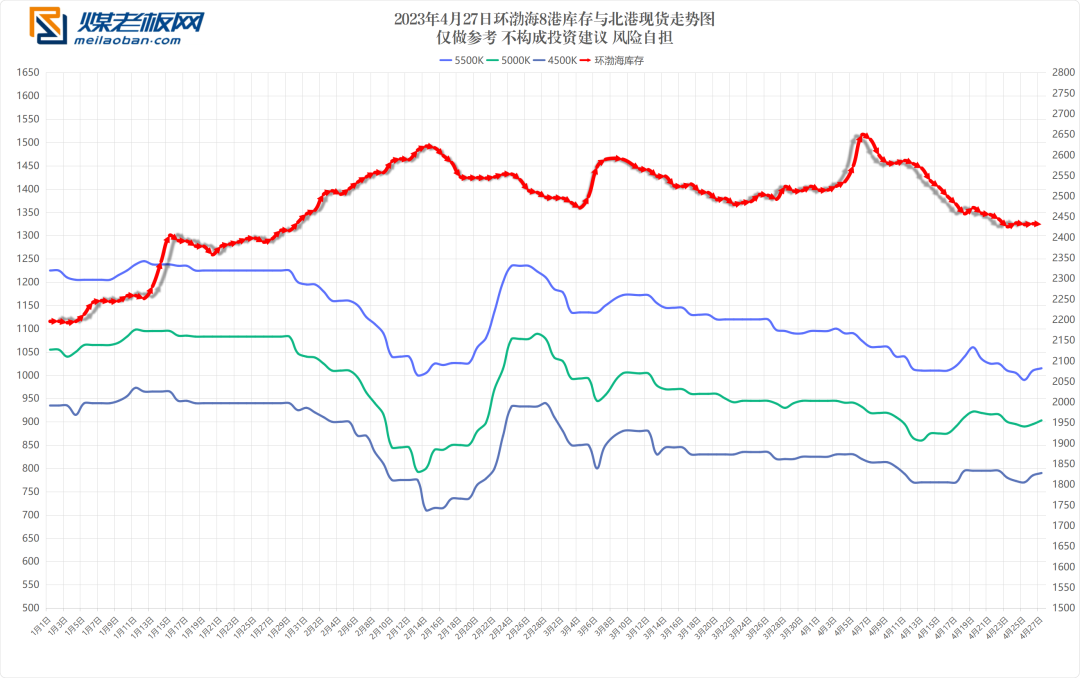 主产地:今日煤价延续小幅上涨为主,除了个别热销矿调价频繁今日沫煤上调30元/吨外,其余调幅延续10~20元/吨,价格变动煤矿数量收缓,坑口此波小涨行情对节前煤市情绪有所提振。主产地部分煤矿五一期间启动检修等,据市场反馈,节前周边煤场、焦企、集运站采购体量和规模均有所增加,煤矿市场煤库存略显紧俏,终端仍谨慎操作以刚需采购为主,煤矿长途拉运多以沉淀的老客户为主。随着节后煤矿检修陆续结束,价格自然或将回落,此轮涨价是否成为节前最后的狂欢,拭目以待。