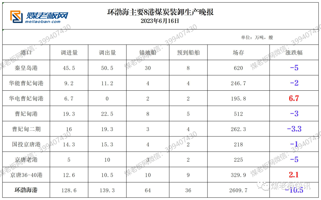 环渤海主要港口煤炭装卸生产晚报