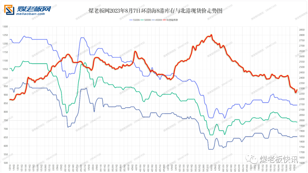 港口:最新北港实际货源报价中卡煤均价对比下跌2元/吨,高低卡煤价格持平,台风影响消减,日耗缓步提升,部分电厂少量采购需求释放,今起立秋,价格仍面临下行风险,贸易商多持观望。最新北港库存合计:2287.6万吨,库存上涨9.6万吨。最新沿海八大电厂调入量128.8万吨,调出量103万吨。最新实际货源报价:5500卡830~850;5000卡735~745;4500卡650~660,实际成交价5500卡830~844;5000卡735~745;4500卡640。