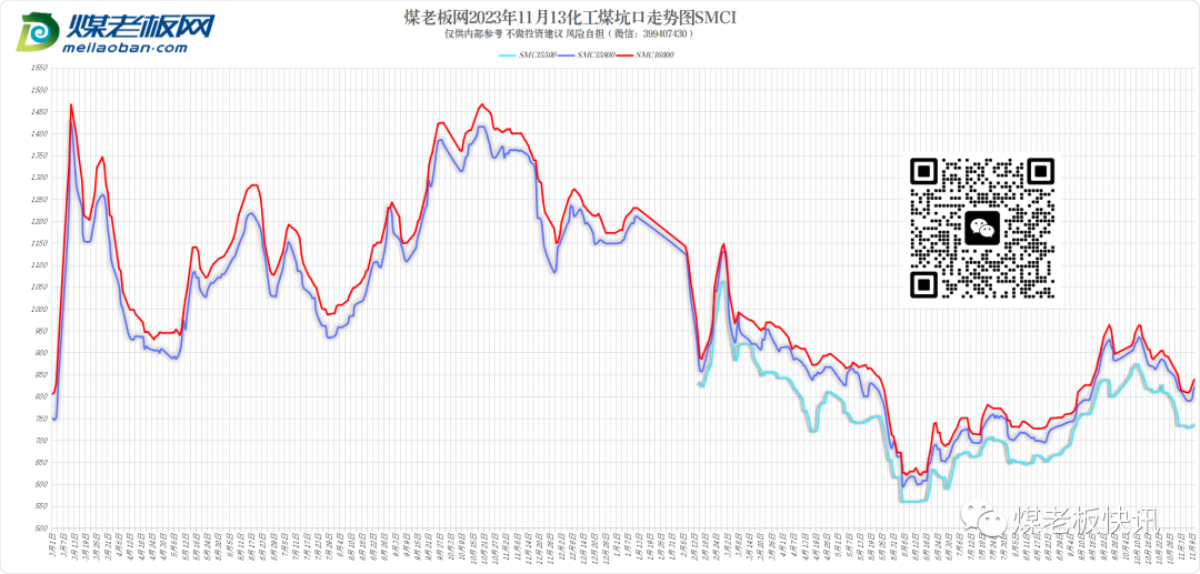 从周末11月11(周六)至11月13日上午,据追踪的主流煤矿来看,价格变动煤矿20家左右(含榆神、府谷、横山、内蒙),2家涨跌互现,2家下跌(块煤降价为主),其余均上涨,部分高卡热量煤矿块煤单次上涨60元/吨,面煤单次上涨55元/吨,仅个别筒仓大块下跌30元/吨。榆阳、府谷、横山区域价格略稳;内蒙区域小涨为主,周末两天部分矿籽、块累涨30元/吨,个别煤矿中块下调10元/吨。