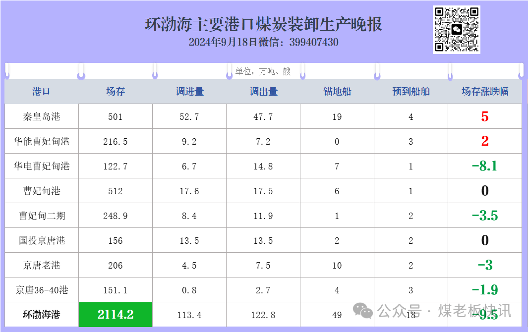 环渤海主要港口煤炭装卸生产晚报