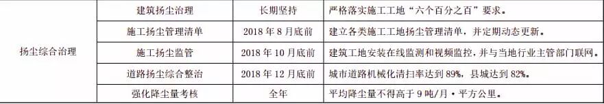 严格施工和道路扬尘监管。2018 年 10 月底前,各城市建立施工工地动态管理清单。建筑工地要做到工地周边围挡、物料堆放覆盖、土方开挖湿法作业、路面硬化、出入车辆清洗、渣土车辆密闭运输“六个百分之百”。