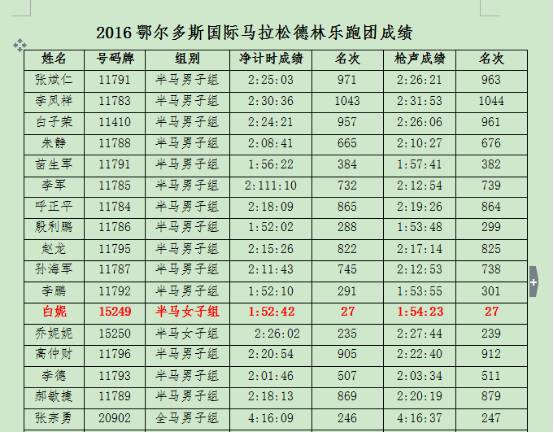 据了解,今年是“德林乐跑团”第一次征战鄂尔多斯国际马拉松比赛。德林乐跑团秘书长张宗勇以4:16:09秒顺利完成全马比赛,19名员工参加了半马比赛,2名员工参加了迷你马拉松,参赛队员全部在规定时间内完成了比赛,其中煤老板网呼叫中心白妮以1小时52分的成绩获得半马女子组的27名。